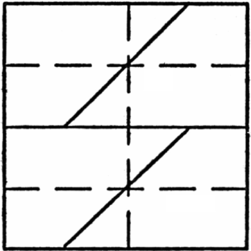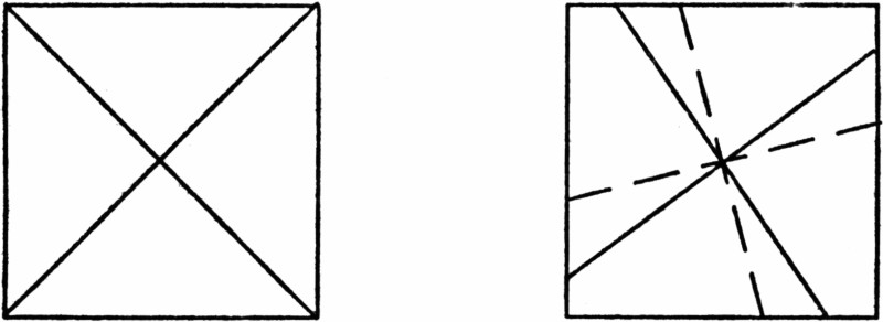 Стоило нам показать это решение детям в экспериментальных школах, как родилось еще несколько способов. Например, один из них — если отрезки одновременно вращать вокруг осей, отмеченных пунктирными линиями, то также будут получаться разные, но равные части квадрата.